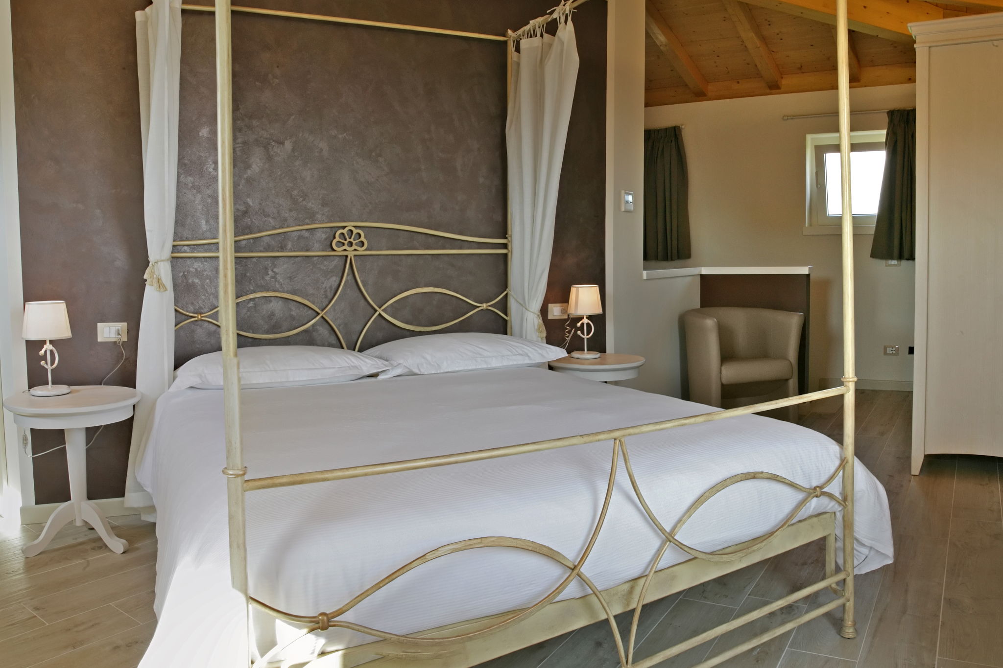 La nostra Panoramic Room “Torretta” è un romantico e raffinato rifugio annidato in cima ad una torre, appartato ed esclusivo. La stanza si apre verso l’esterno attraverso un piccolo balcone da cui si può godere di un panorama mozzafiato e attraverso sette piccole finestrelle, che donano agli ospiti viste uniche: a nord si può ammirare il possente Monte Baldo ergersi alto tra le nubi, a est la verdeggiante catena montuosa della “Lessinia”, a ovest il campanile dell’affascinante seicentesco “Eremo San Giorgio” circondato da alti cipressi che domina l’omonimo monte, e a sud le colline ricoperte di oliveti e vigneti, i piccoli paesi lacustri, e il limpido specchio del Lago di Garda.